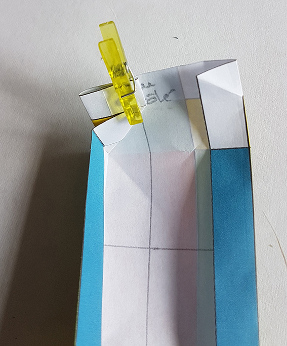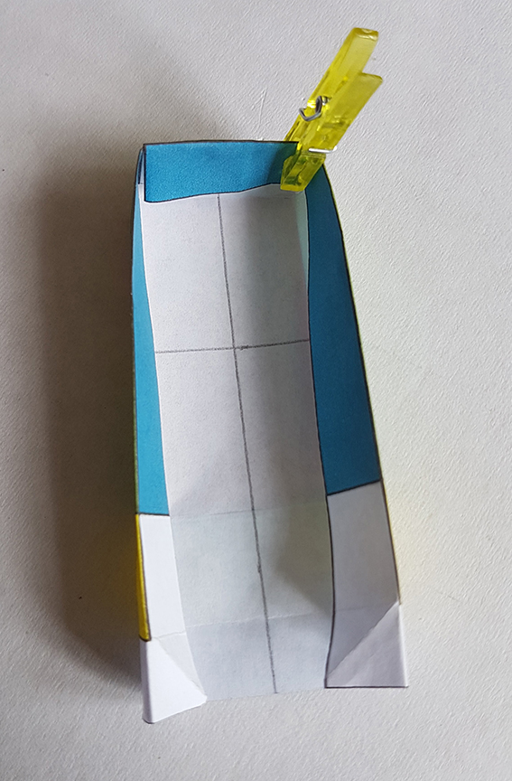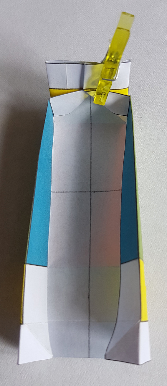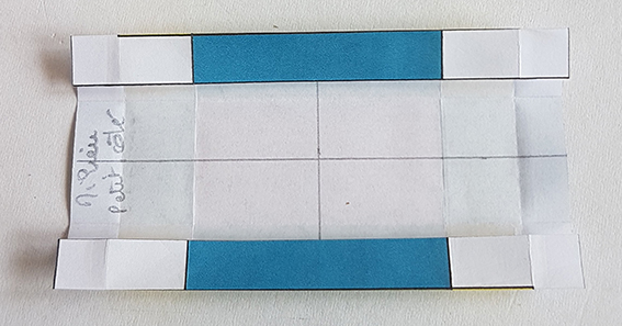 Sur le dos du rectangle, tracer les deux médianes et un trait sur 1/3 de la forme.