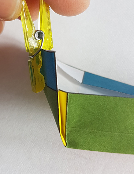 Replier le carré jaune sur lui-même, le long de sa pliure, puis vers l'intérieur de la boîte.